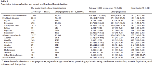 Because of the sheer number of women included in the study and the magnitude of these differences between the two groups, these differences are statistically significant. In other words, they aren’t due to chance. And they are very unlikely to be due to other factors, as the authors already controlled for other factors (e.g. age differences or preexisting psychiatric conditions) that might be the real cause of the differences. Having an abortion was correlated with these mental health-related hospitalizations.