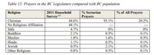 Rebuttal: The BCHA’s argument that legislative prayer is discriminatory and disproportionately favours Christianity is based on a misrepresentation of the facts. Below is a chart produced within the BCHA’s report: