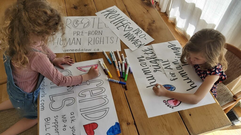 If you aren’t able to attend a March for Life this year, consider making a sign anyway to hang in your window the week of May 7-13 in connection with Life Week. We did this during Covid when marches were cancelled, and it was a fantastic way to start conversations right in our own neighbourhoods. Sidewalk chalk and window paint also work great for at-home versions!