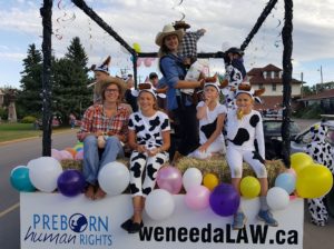 Olij says while it may be a fun theme, it didn’t really give his group much to work with. In the end, they borrowed a giant cake from a pro-life group in Langley, and emblazoned it with the words “every child deserves a birthday party”. As for the “cows coming home”, they towed a flatbed trailer behind the truck as kind of a mobile stage. They put a makeshift mechanical bull on it, and Olij says he did his best to make people laugh. He says the response at the parade was positive, and the experience was another example of how sometimes it’s good to think outside the box to get the pro-life message out there.