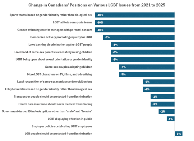 Although Canadian values are largely offside God’s created order of gender and sexuality, there are glimmers of hope. Not that our hope is in earthly change, for “we rejoice in hope of the glory of God. Not only that, but we rejoice in our sufferings, knowing that suffering produces endurance, and endurance produces character, and character produces hope, and hope does not put us to shame, because God’s love has been poured into our hearts through the Holy Spirit who has been given to us” (Romans 5:2-5). But the Canadian public hasn’t entirely bought transgender ideology yet, especially when it comes to the issues of medical transitioning and sports policy. And we are seeing a trend in the right direction, with declining support across the board for the LGBTQ cause.