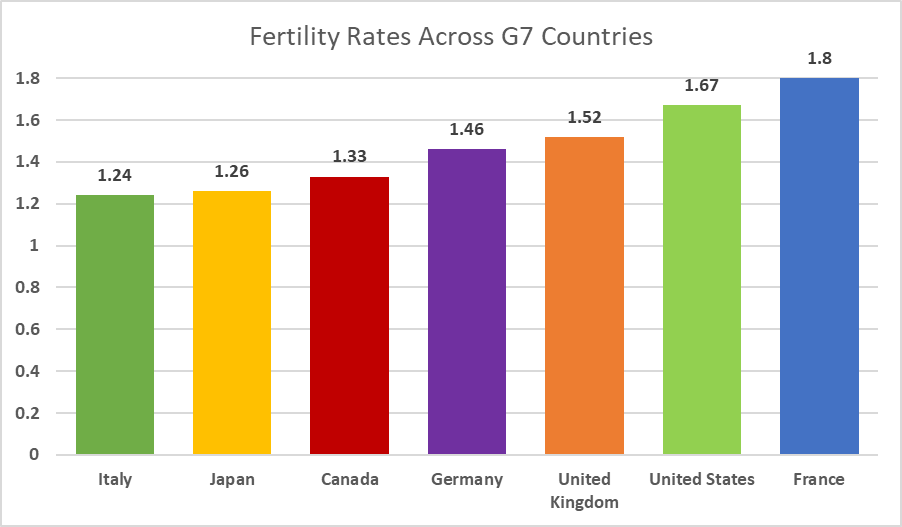 This trend is not unique. The fertility rates across the G7 (a group of Canada’s comparable wealthy and democratic peer countries) are all below the replacement rate of 2.1, according to the Statistics Canada Report.