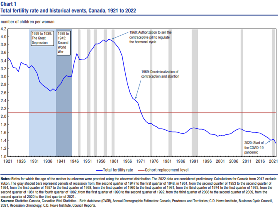 What does this statistic mean? Well, the fertility replacement rate is 2.1, meaning that if the average woman in Canada had 2.1 children, Canada’s population would remain the same. This makes intuitive sense. Each woman would have to have two children to replace herself and her husband. Since not every woman lives long enough or is able to have children, the replacement rate is a little bit higher than two. If fertility rates exceed 2.1, then Canada’s population would grow, but if fertility rates are below 2.1, the Canadian-born population will decline.