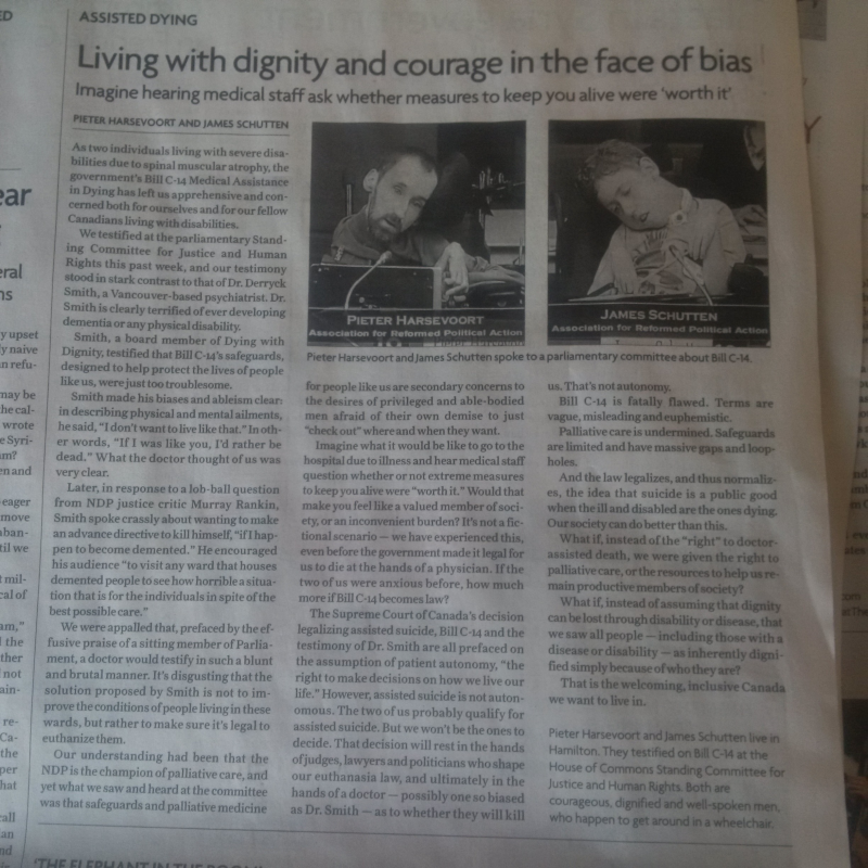 The following article was published in the Hamilton Spectator on May 24th. It was written by Pieter Harsevoort and James Schutten, after they presented with ARPA Canada to the House of Commons Standing Committee on Justice and Human Rights. Because legalized euthanasia and assisted suicide will most directly affect people with severe disabilities, as James and Pieter have, Canadians – lawmakers in particular – must listen to their story. Here is their perspective: