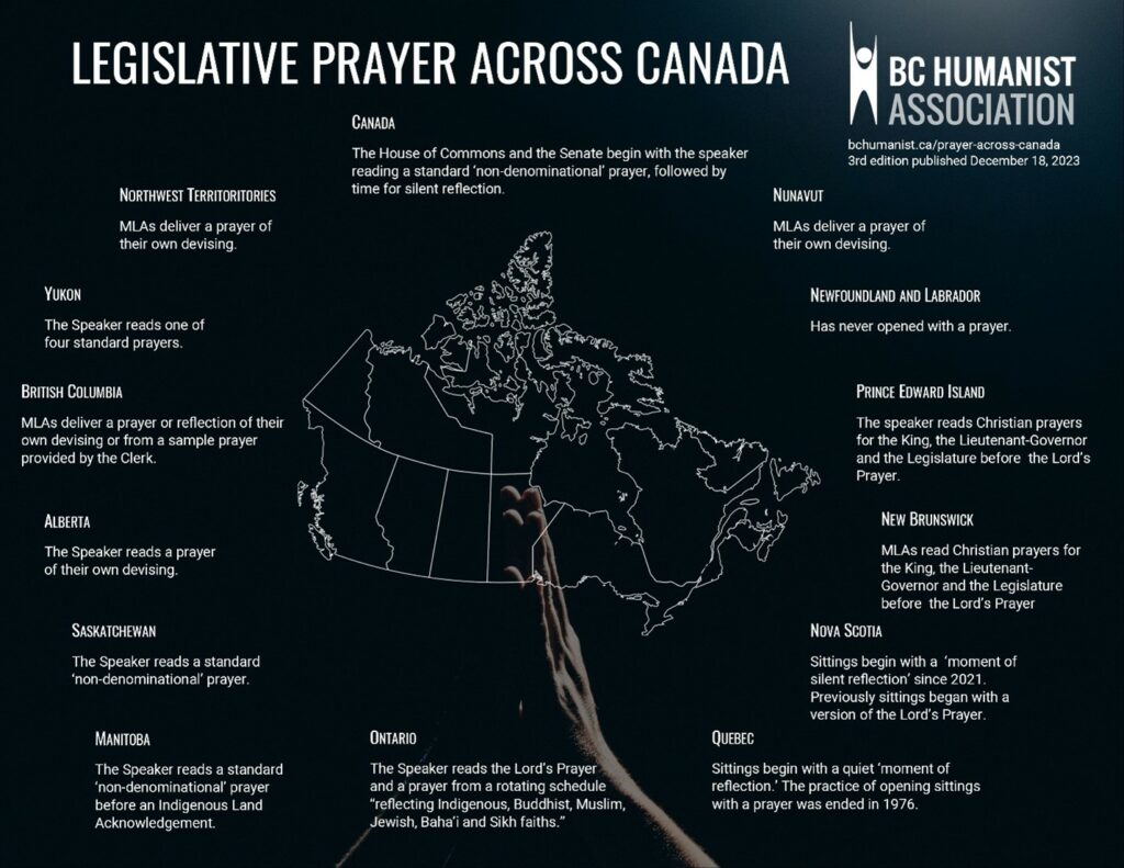 Prayer at the opening of each day at the legislature is a longstanding tradition in the British Parliamentary system, the system of government that Canada’s government is based on. The federal government and almost every provincial government offer such daily prayers. (The BC Humanist Association, very much against the offering of religious prayers in legislatures, has a handy infographic and report of standard practices across the country.)