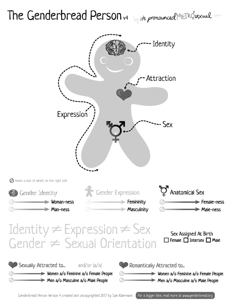 [14] For visual illustrations of this concept, consider the Genderbread Person and the Gender Unicorn from It’s Pronounced Metrosexual, “The Genderbread Person Version 4,” It’s Pronounced Metrosexual, 2020, https://www.itspronouncedmetrosexual.com/2018/10/the-genderbread-person-v4/; Trans Student Educational Resources, “Interactive Gender Unicorn,” 2015, https://transstudent.org/gender/.