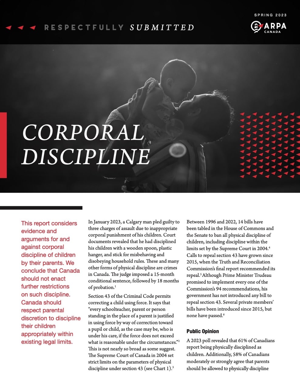 This report considers evidence and arguments for and against corporal discipline of children by their parents. We conclude that Canada should not enact further restrictions on such discipline. Canada should respect parental discretion to discipline their children appropriately within existing legal limits.