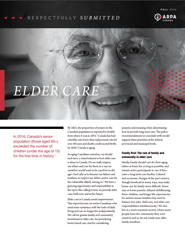 As aging Canadians ourselves, we should each have a vested interest in how elder care is done in Canada. Do we really respect our elders and care for them in a way we ourselves would want to be cared for in old age? God calls us to honour our fathers and mothers, to respect our elders, and to care for the vulnerable elderly among us.[iii] We have a growing opportunity and responsibility to live up to this calling in how we provide elder care, both now and in the future.