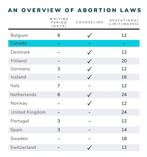 - Introduce an International Standards Law. Bring Canada in line with other democratic countries by banning abortion after the first trimester, ensuring access to independent counseling to screen for coercion or abuse, and implementing a waiting period between requesting and receiving an abortion.