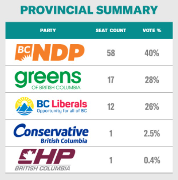 Two weeks ago, British Columbians went to the polls to elect a new provincial government. A little over a year ago, Canadians also elected a new federal government. We all know the outcomes: the BC NDP won a solid majority at the provincial level, with the BC Liberals bleeding seats and BC Greens maintaining their support. At the federal level, the Liberals won a minority government. The Conservatives formed the official opposition, though under-performed expectations. The NDP staved off collapse. The Bloc Quebecois made a resurgence in Quebec. The Greens failed to capitalize on recent provincial successes. And the upstart People’s Party failed to gain a seat.